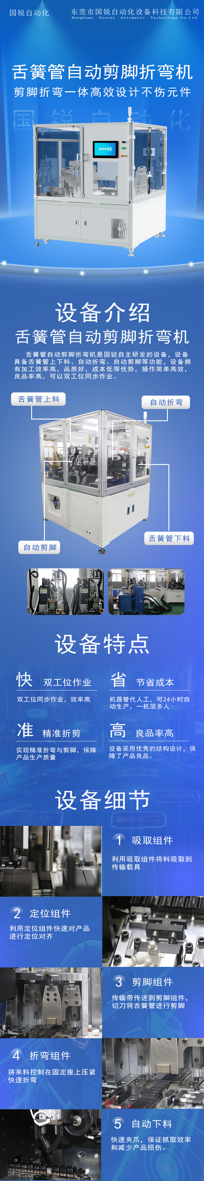 舌簧管自動剪腳折彎機(jī)是國銳自主研發(fā)的設(shè)備,設(shè)備具備舌簧管上下料、自動折彎、自動剪腳等功能,設(shè)備擁有加工效率高,品質(zhì)好,成本低等優(yōu)勢,操作簡單高效,良品率高,可以雙工位同步作業(yè)。